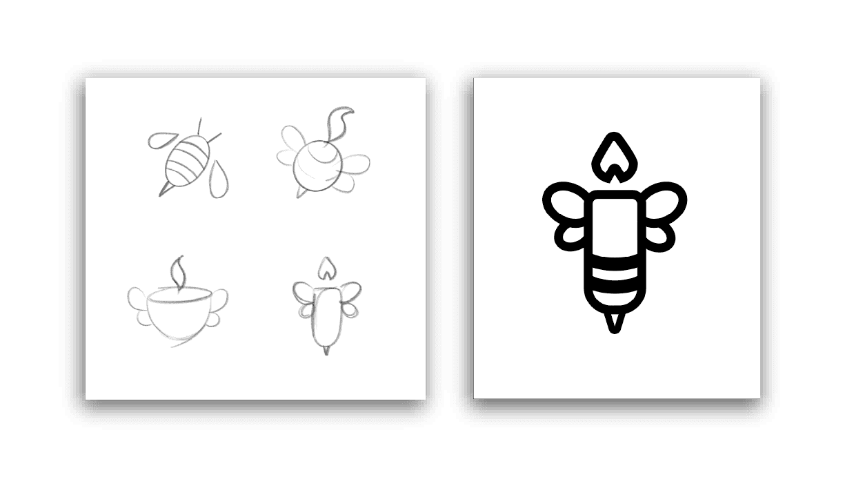 Early sketches explored combining a bee’s structure with a candle structure to create a friendly and recognizable symbol. The final icon was selected for its clarity and ability to communicate warmth and care while reading clearly as both a bee and a candle at a glance.
