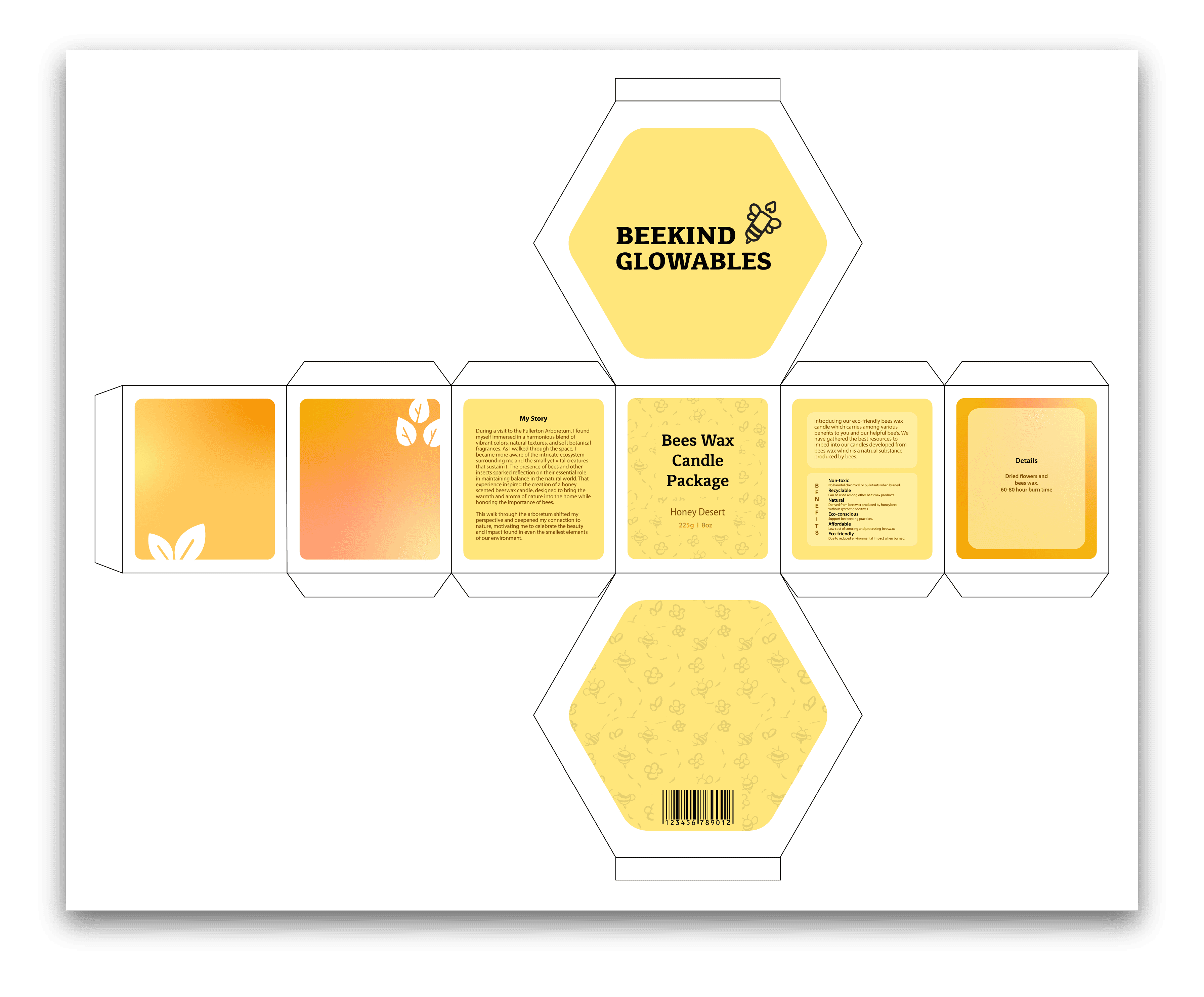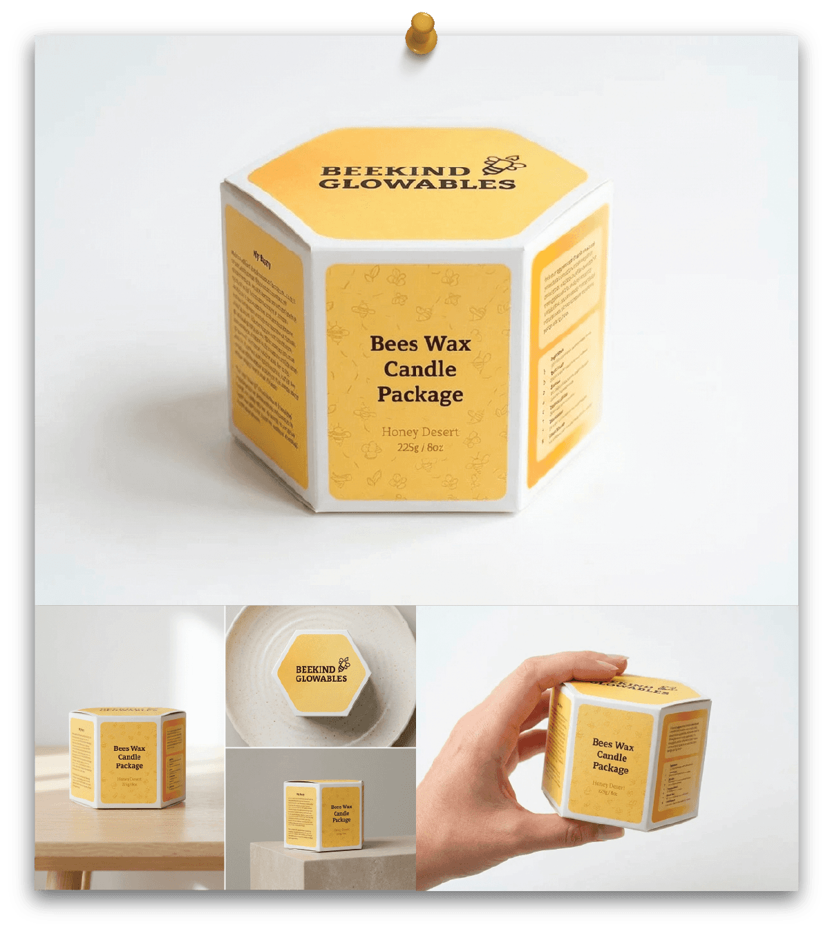 The packaging layout is built around a hexagonal form inspired by honeycombs. This structure reinforces the brand