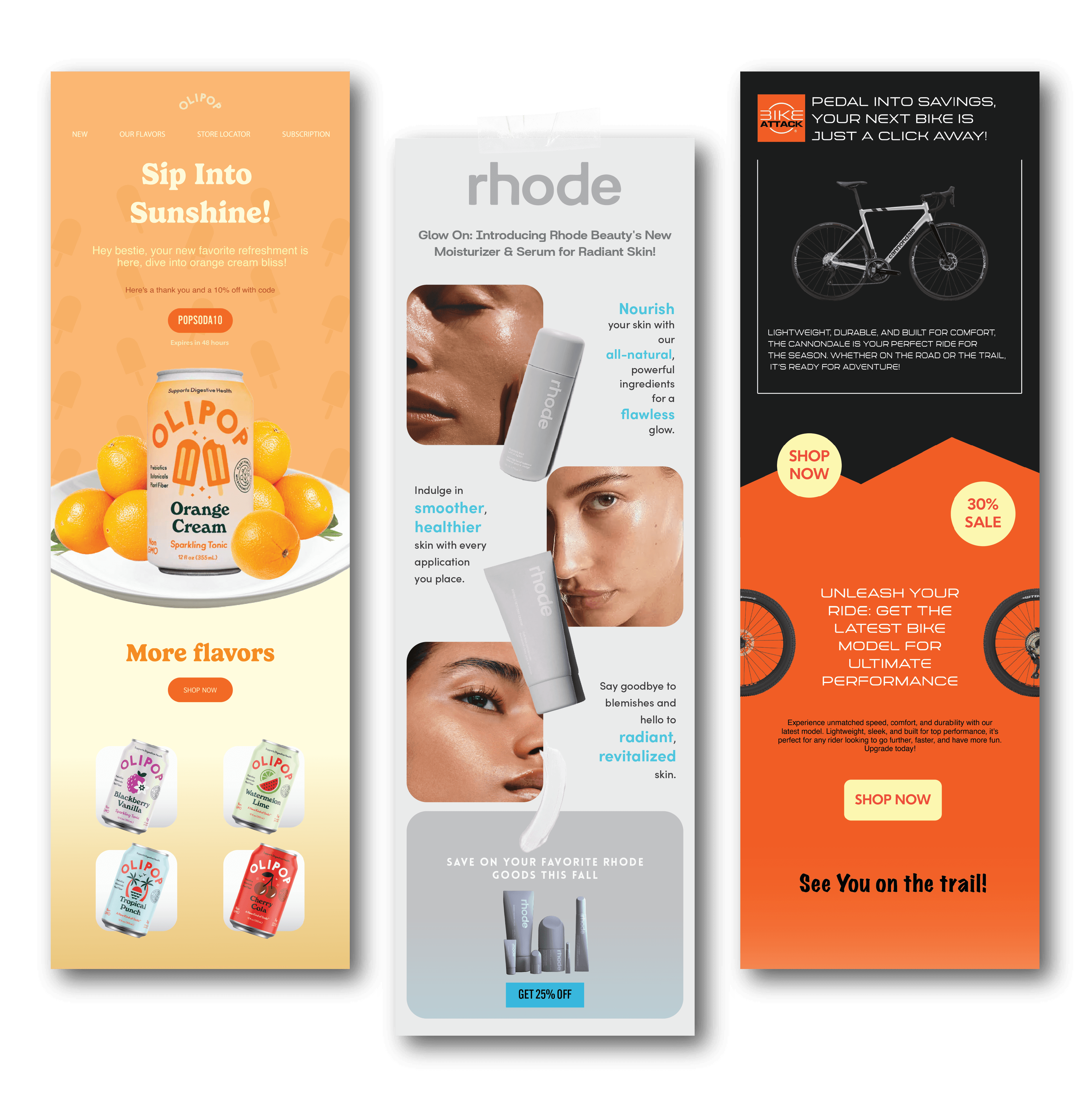 These email designs showcase brand identity while promoting products, sales, and seasonal campaigns. Using bold headlines, compelling visuals, and clear calls to action, each layout balances visual appeal with function. Spanning industries from skincare to bikes to beverages, they demonstrate my adaptability while maintaining clarity, hierarchy, and brand consistency.