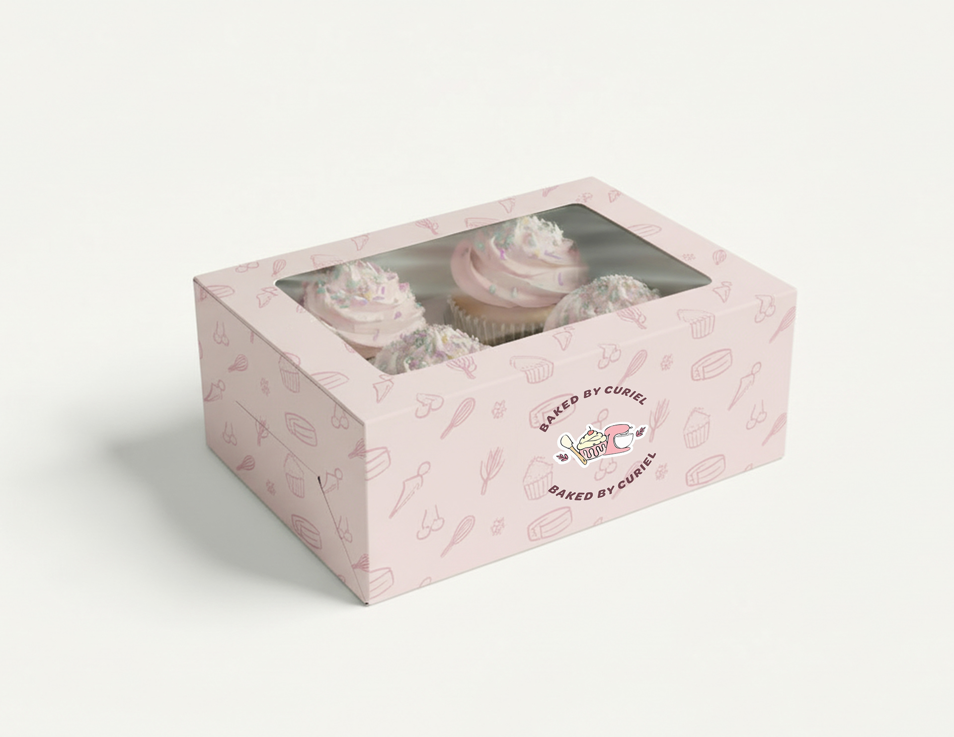 Cupcake packaging design featuring playful baking inspired illustrations and a soft pastel color palette.