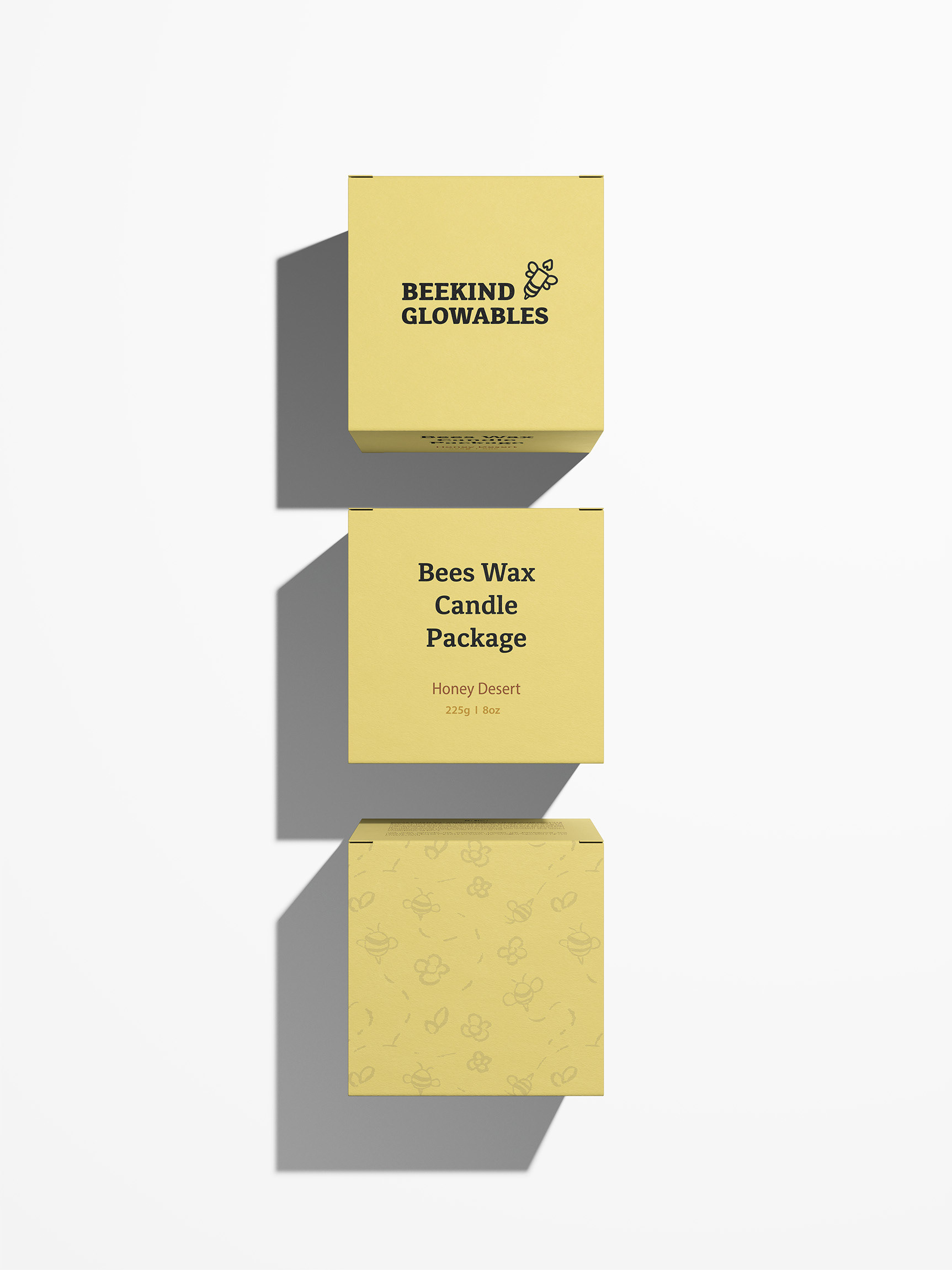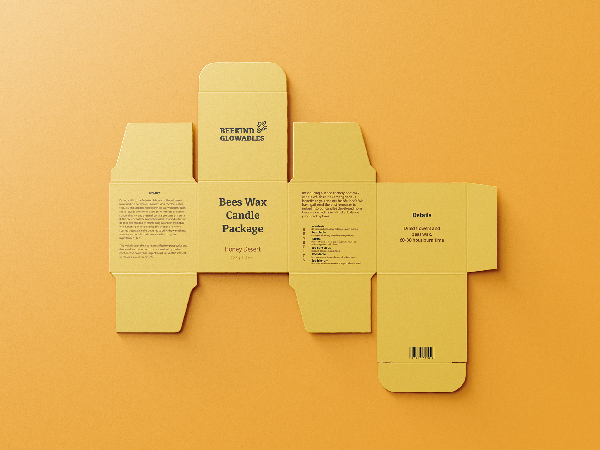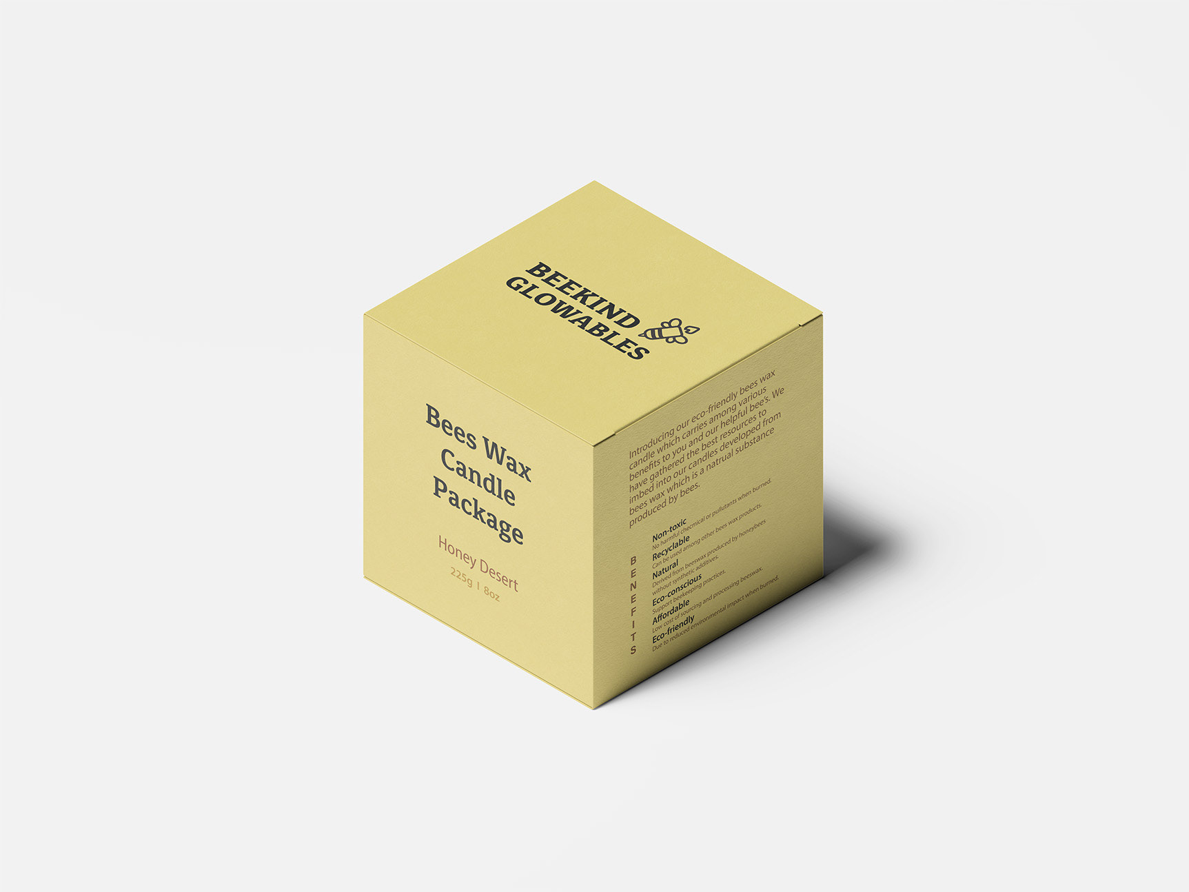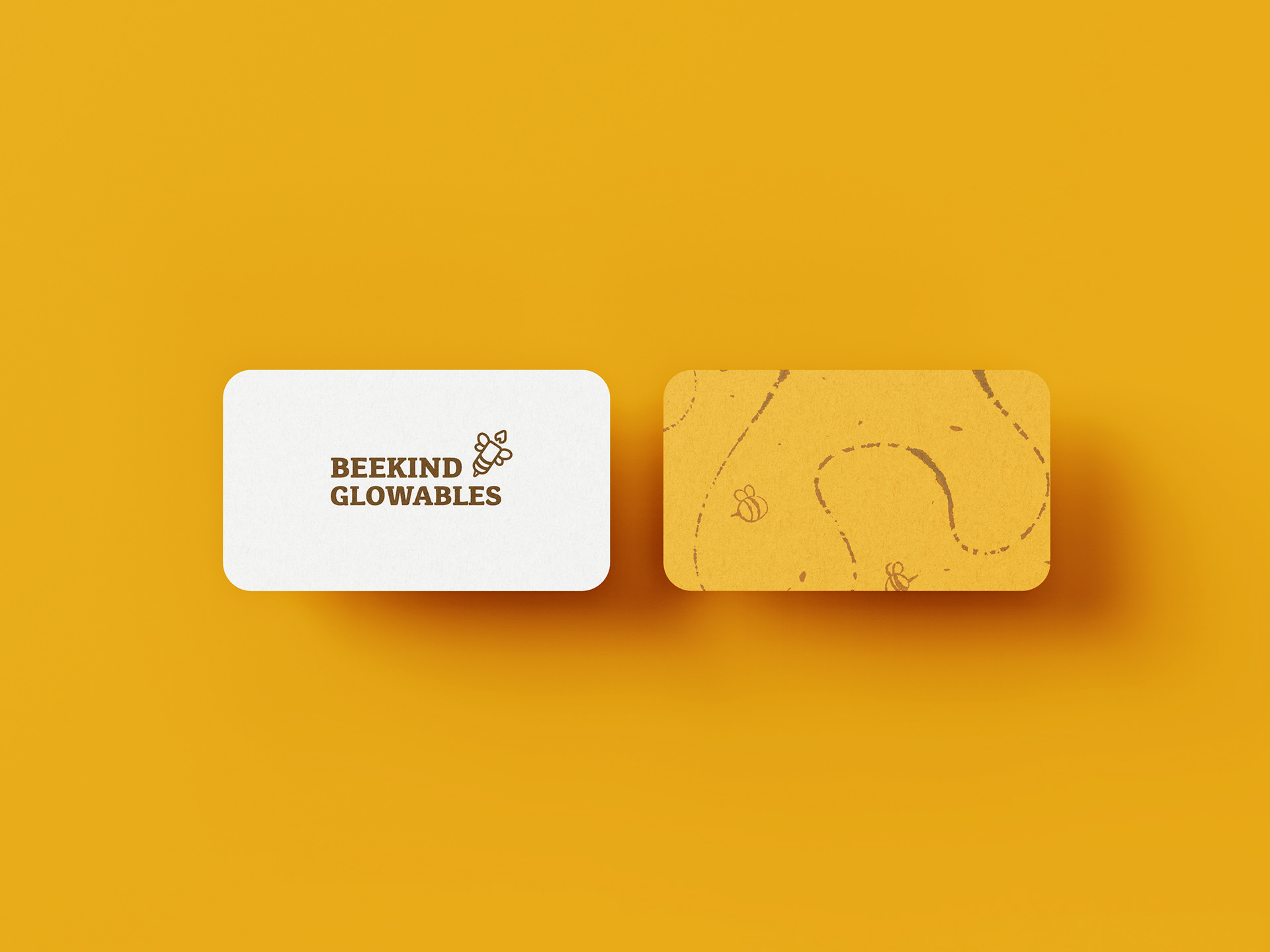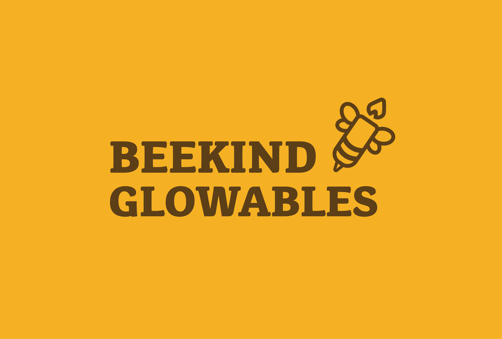 BeeKind Glowables is a conceptual beeswax candle brand focused on sustainability and warmth. The identity combines a bee symbol and candle flame to represent natural light and environmentally conscious design.