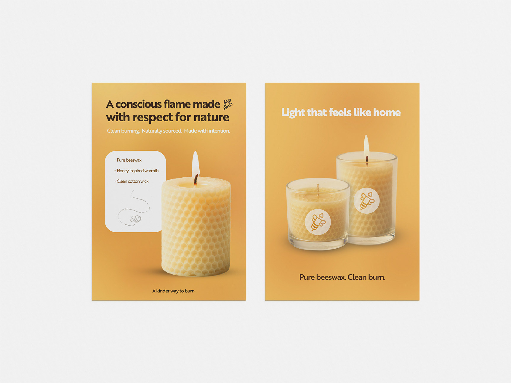 The identity combines a bee symbol and candle flame to represent the connection between bees, beeswax, and natural light. The playful icon system reinforces the brand’s message of kindness toward nature while maintaining a warm and approachable personality.