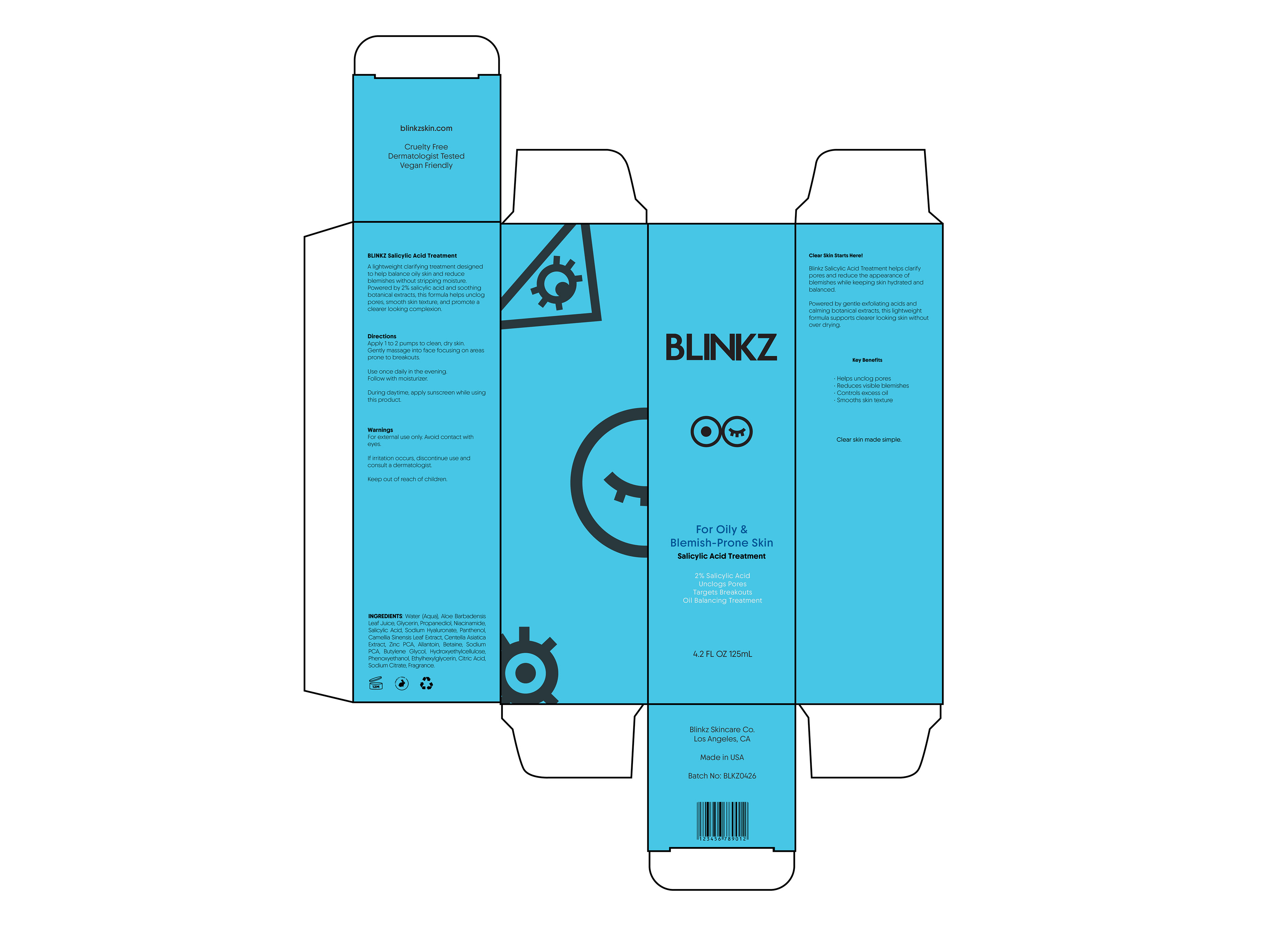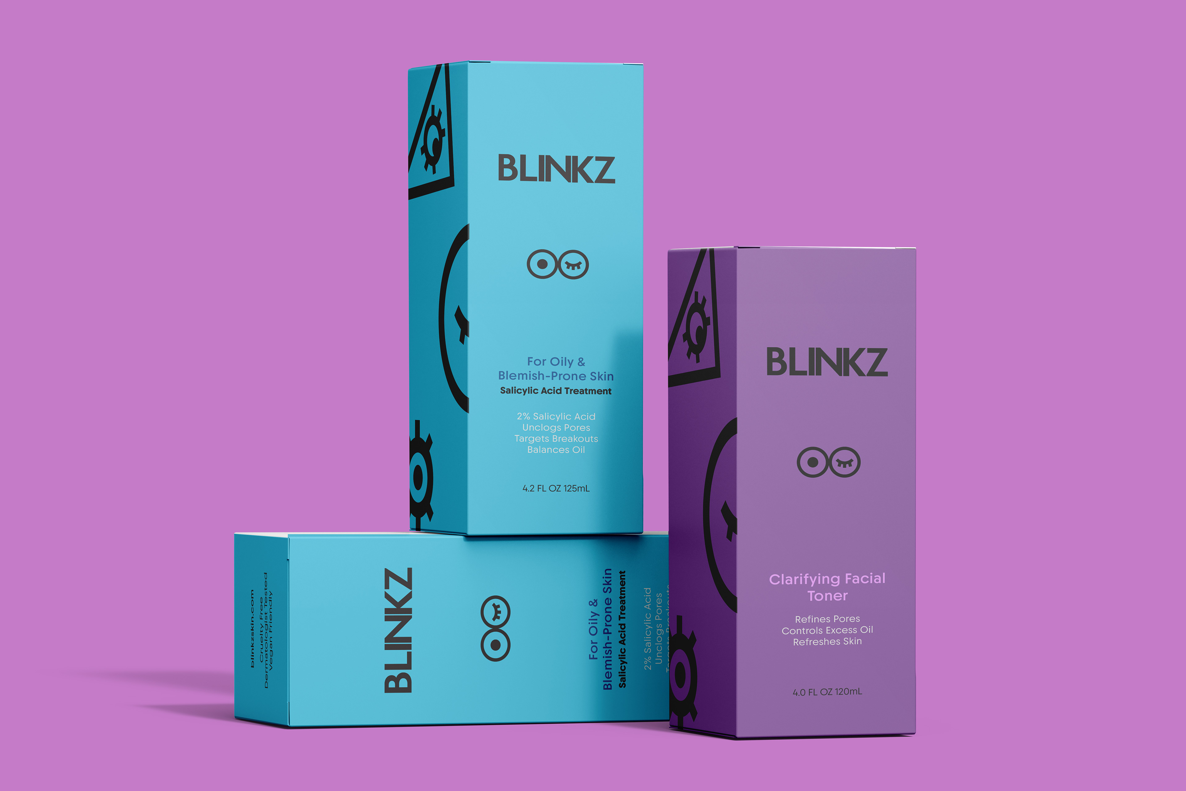 Blinkz is a skincare brand designed for Gen Z consumers, combining bold colors and playful iconography to represent daily skincare routines.