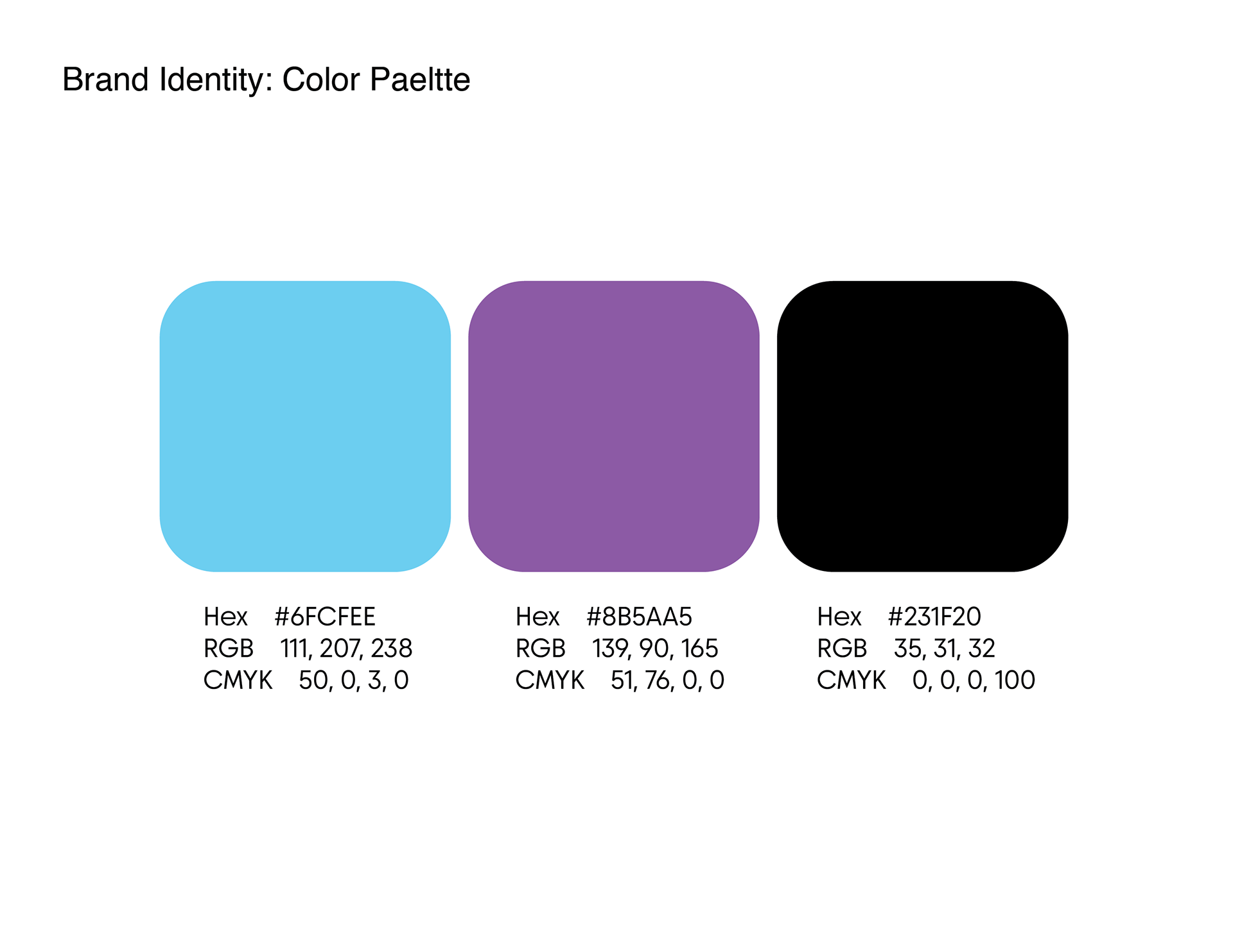 The color palette combines calming and expressive tones to reflect the brand’s personality. Light blue represents freshness and clarity, purple introduces a sense of self care and wellness, while black adds contrast and boldness to the overall identity.