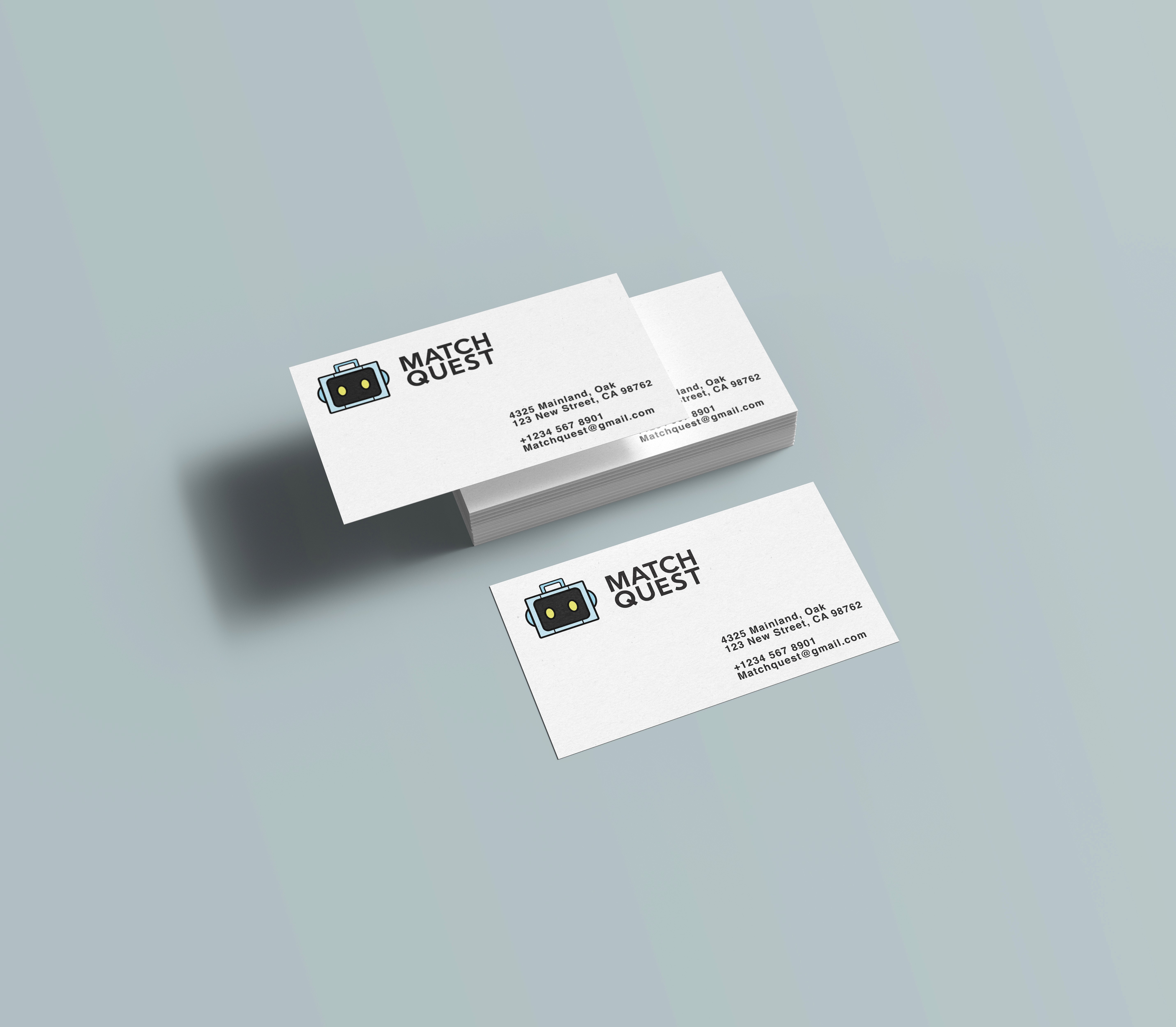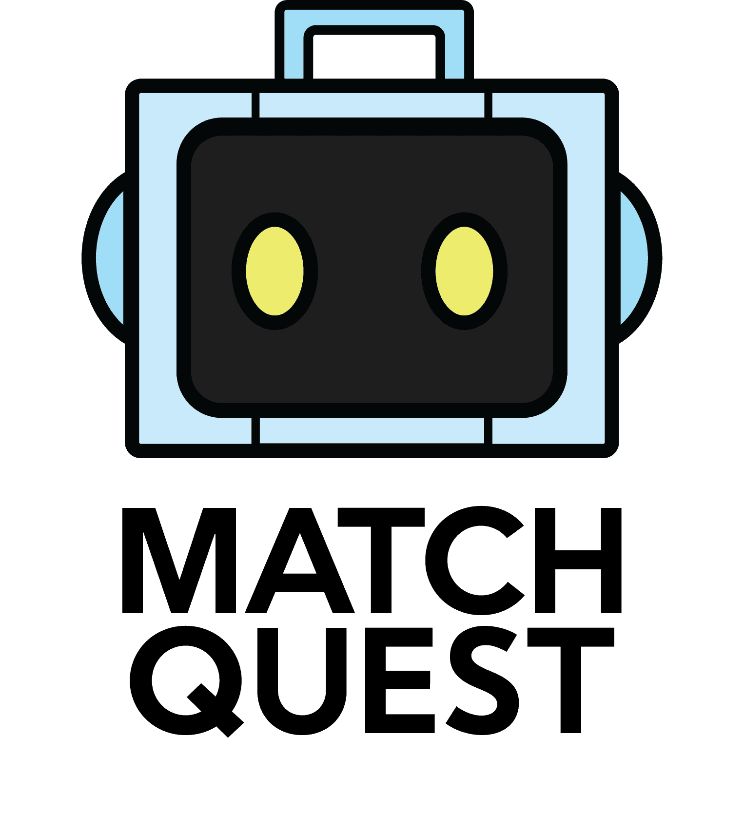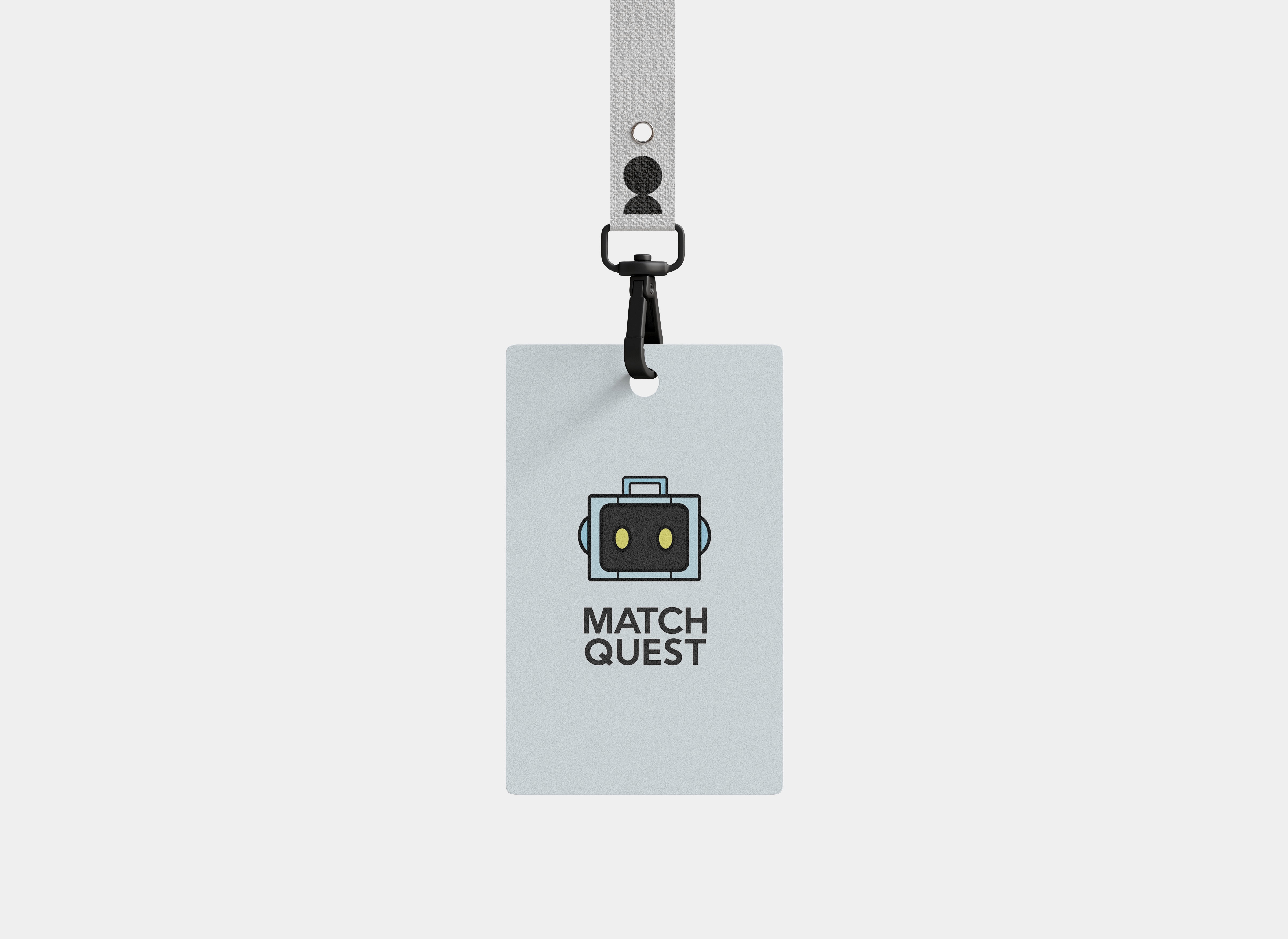 The Match Quest logo merges a robot, symbolizing tech driven networking, with a suitcase, representing professionalism and opportunity. Together they form a distinctive character that reflects the brand’s focus on partnership, connection, and business, balancing a playful personality with a clear and purposeful identity.